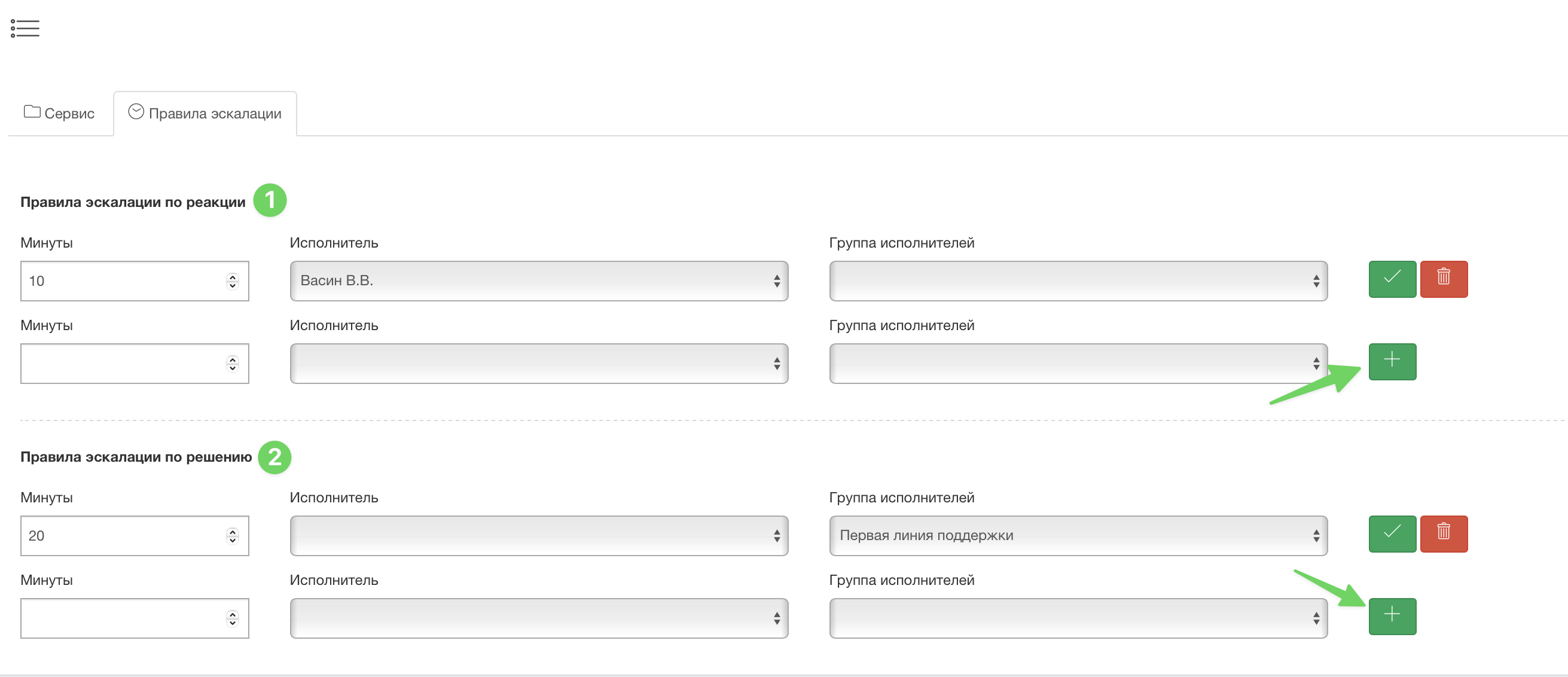 Правила эскалации по реакции - здесь вы можете создать несколько правил автоматической эскалации заявки на пользователя или группу, если заявка не была принята в исполнение в течение указанного в правиле количества минут. При срабатывании правила система автоматически переназначит исполнителя / группу. Данных правил может быть несколько.